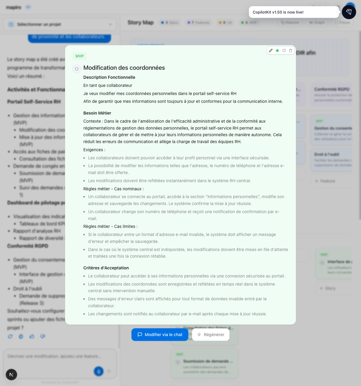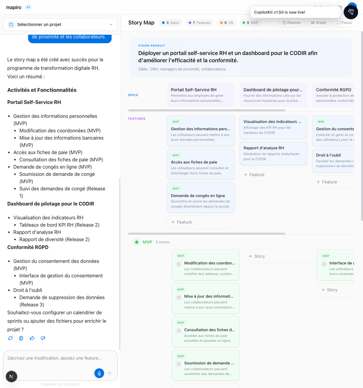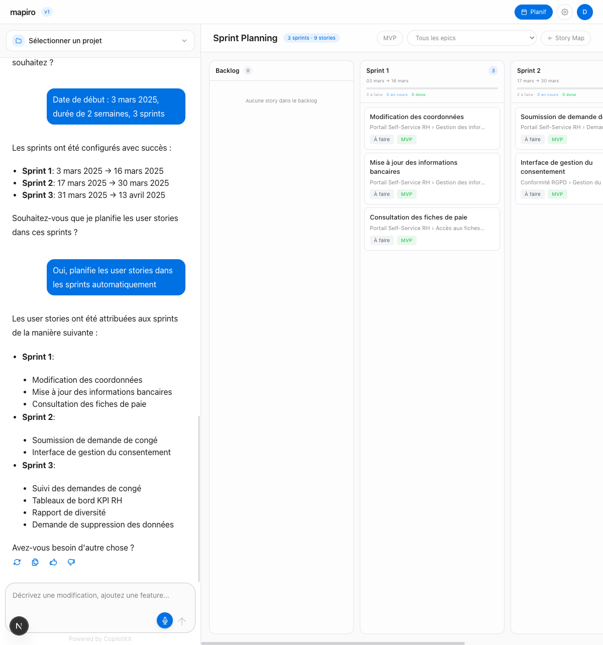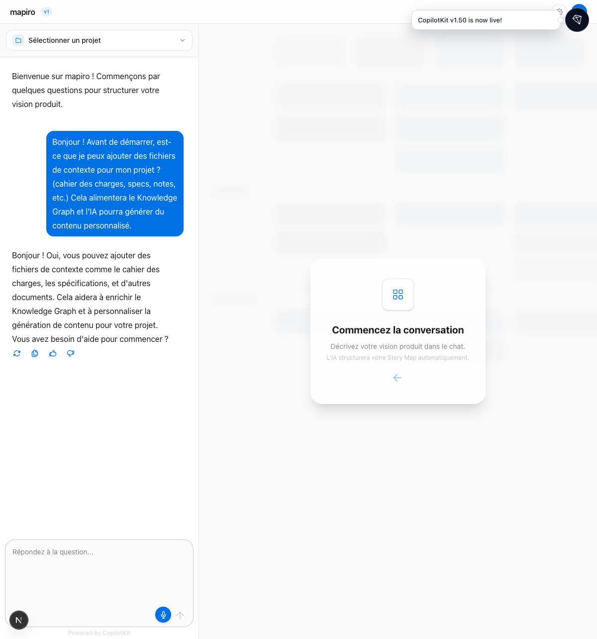 L'interface mapiro : le chat IA à gauche pour décrire le contexte, le canvas Story Map à droite qui se remplit au fil de la conversation.